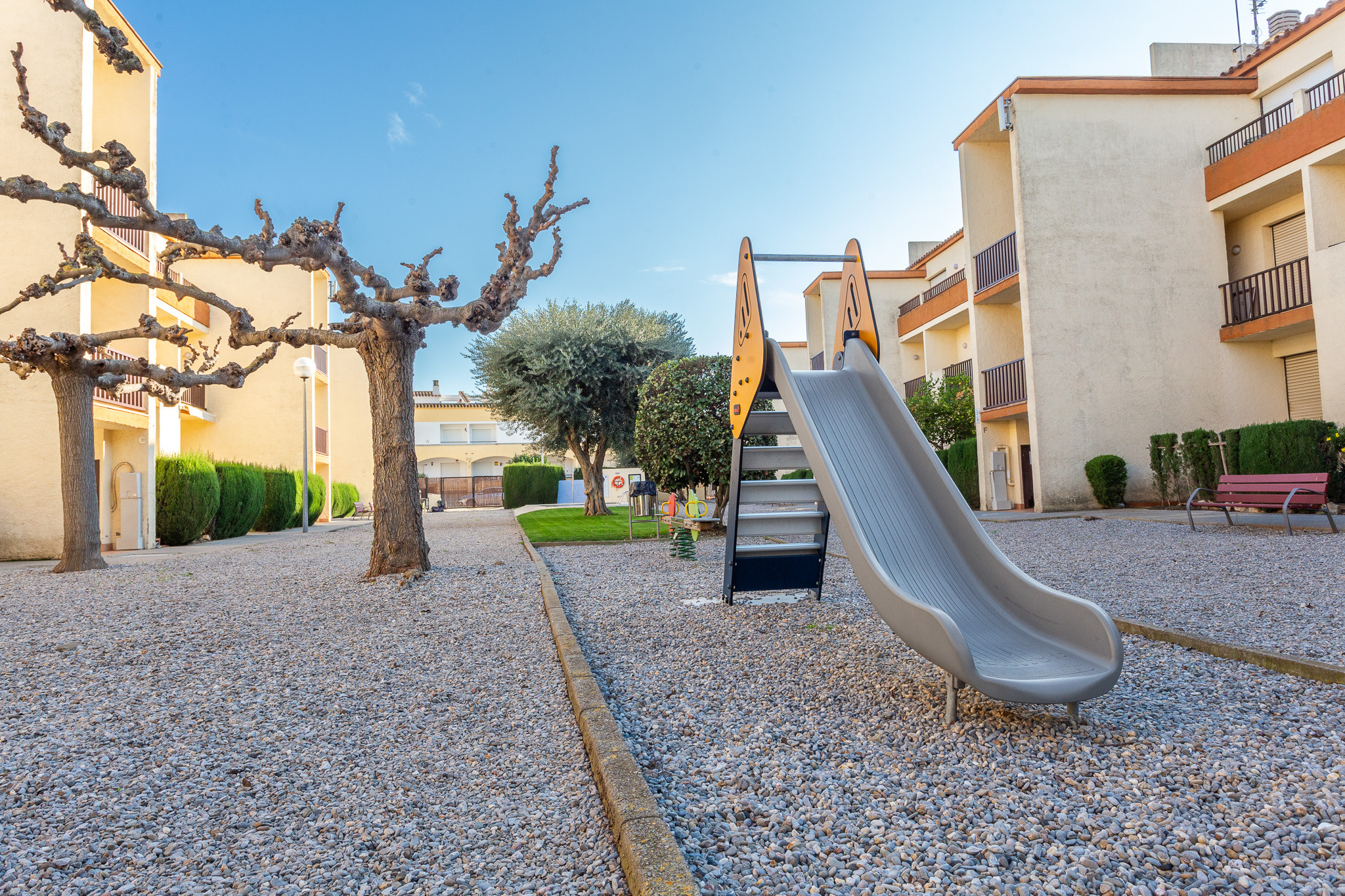 This apartment is ideal for a family holiday. It is located in a quiet area, just 200 meters from the most beautiful beaches and Empuries Park. The historical part of the city with its extraordinary atmosphere, cozy restaurants, bars and shops is 400 meters from the complex. Just 150 meters from the apartment there are LIDL and Mercadona supermarkets, a wine boutique, Burger King and an intercity transport stop, which will easily allow you to get to Girona, Figueres and Barcelona. The territory of the complex is closed from outsiders and has free Parking, a swimming pool with a lawn and a children’s playground surrounded by olive trees. The apartment has 2 bedrooms, a living room and a fully equipped kitchen. Each room has large stained-glass windows with a beautiful view of the forest and private houses. There is a large dining table in the living room, which can comfortably accommodate the whole family. There is also an outdoor dining table on the terrace. In all our apartments you will find such pleasant little things as: dishwashing liquid, a sponge, a rag, etc., so that in the first days of your stay you do not run around shopping, but calmly put things out and rest from the road.