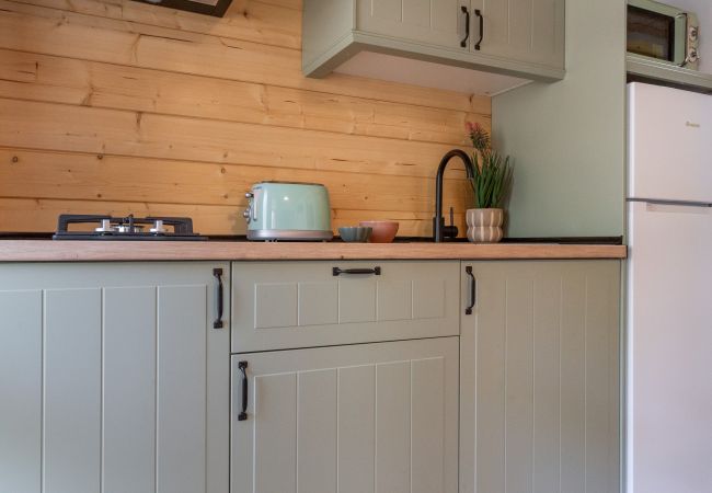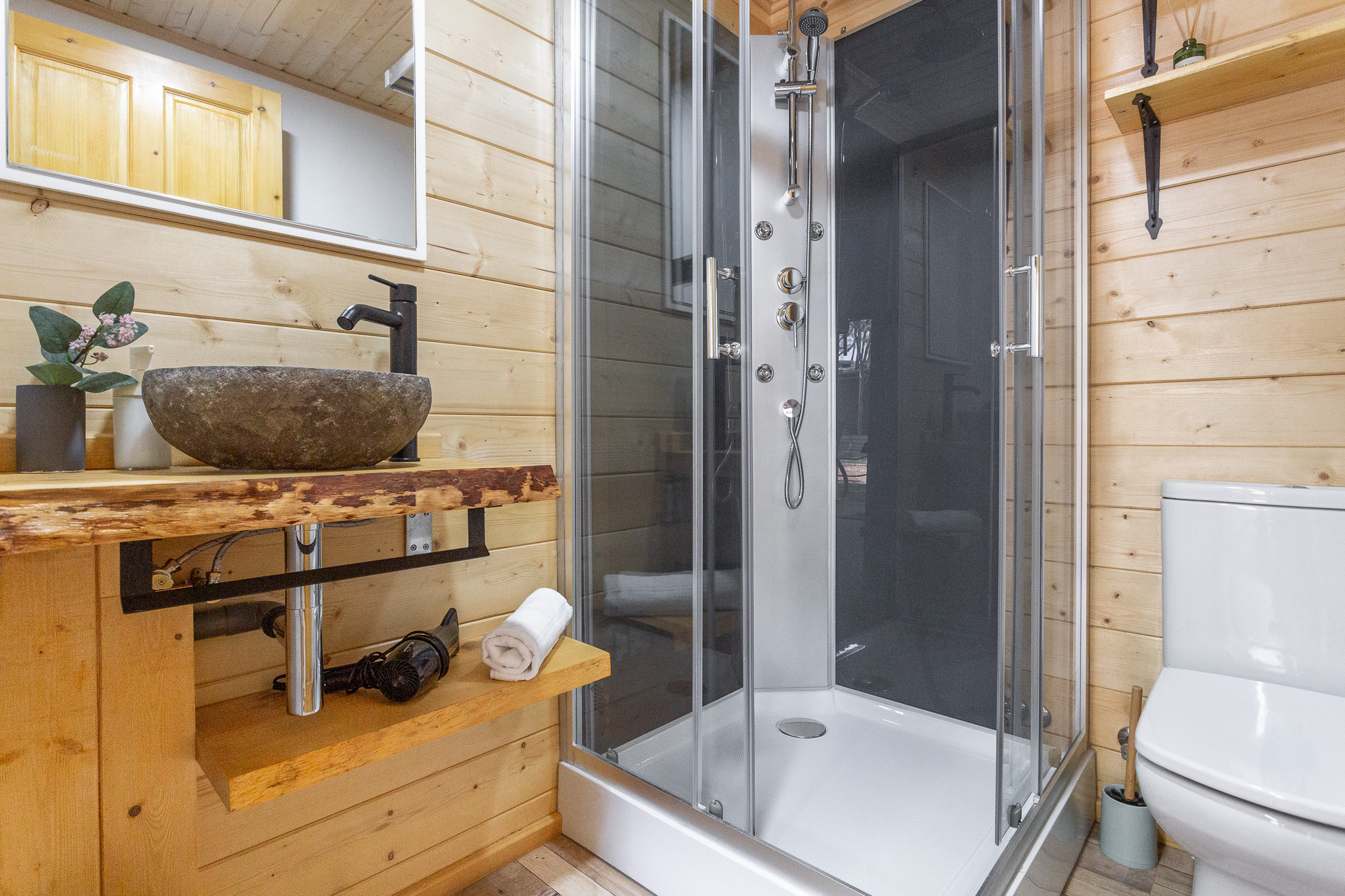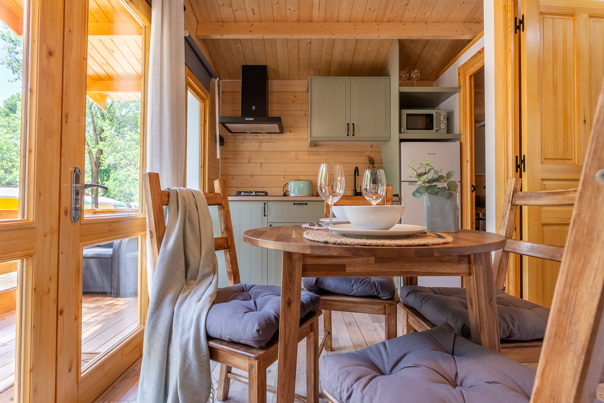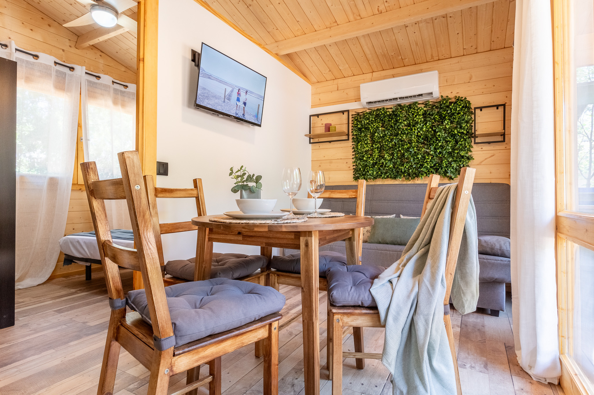 The bungalow is made of wood and you breathe pure air. The small house consists of a bedroom, an en-suite bathroom with a shower, a living-dining room and a fully equipped mini-kitchen. A lot of natural light comes in through the large windows and a wide opening with access to the terrace where there is a sofa and a coffee table. The bungalow has a reversible air conditioning, to cool you down in summer and warm you up in winter.