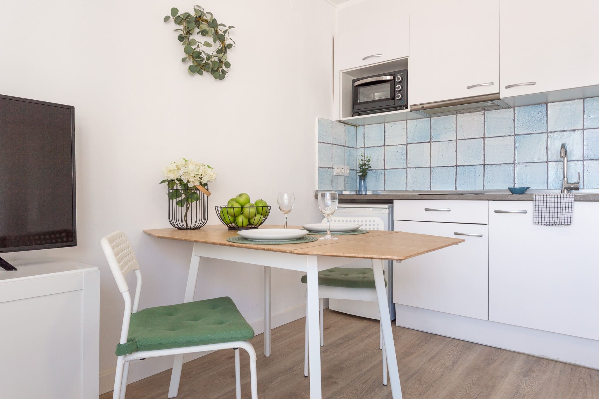 The studio apartment is located 700 meters from Riells beach and the promenade with bars, restaurants, shops. This is a compact and comfortable space with everything you need for a carefree holiday: a comfortable mattress and pillows, TV, a kitchen equipped with everything necessary for cooking, a dining table, free Wi-Fi. The studio has its own bathroom with a shower and terrace. There is a parking lot in the courtyard of the house, where you can easily park your car. 400 meters away there is a supermarket.