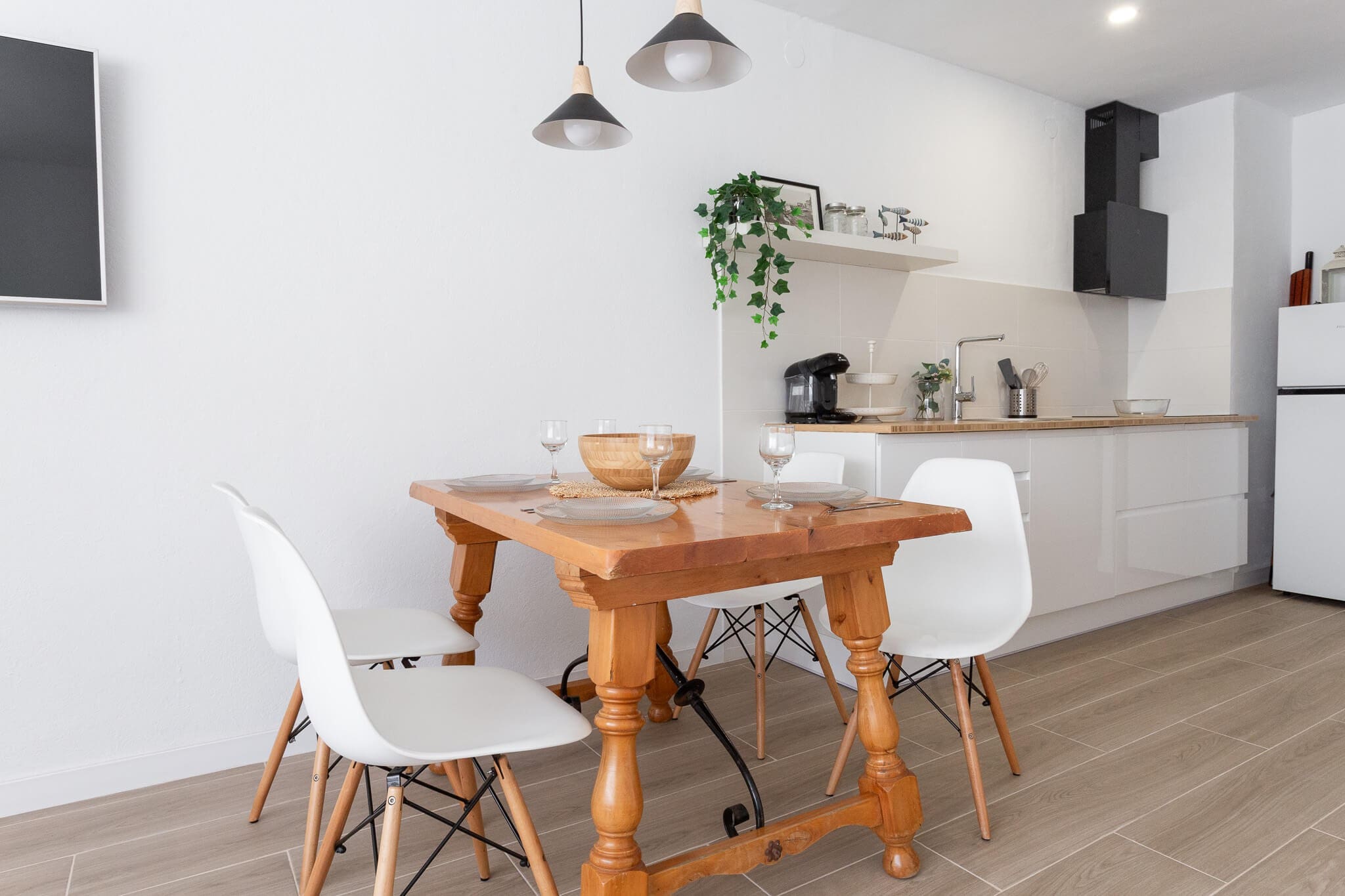 Cocina independiente totalmente equipada (nevera, congelador, lavadora, cafetera, horno y microondas) con todo el menaje necesario para sentirte como en casa.