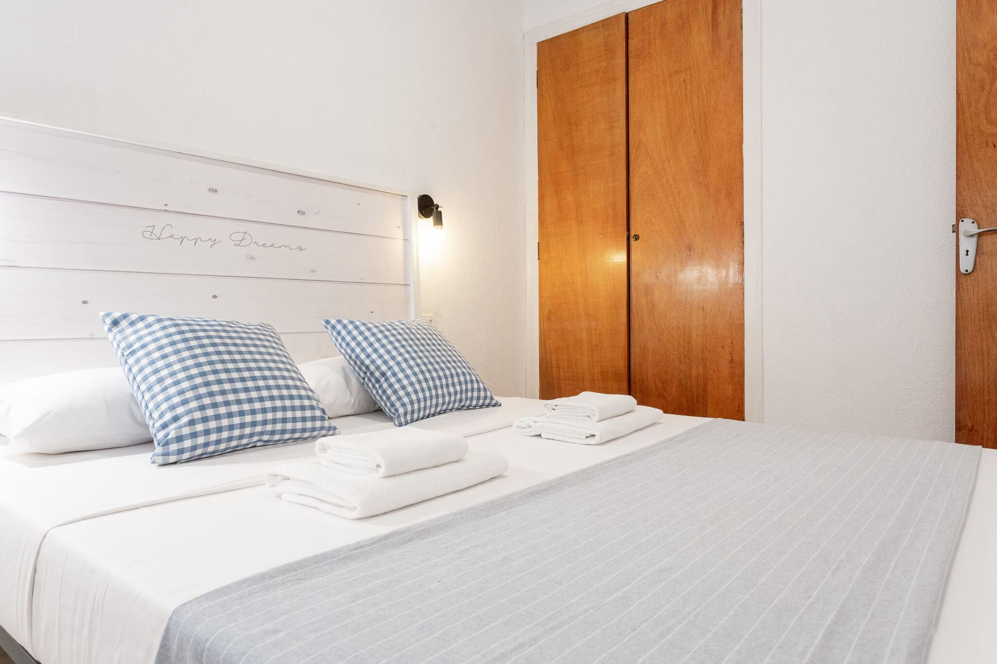 El apartamento está en planta primera y consta de habitación de matrimonio con vista al mar y acceso a la terraza, otra habitación sin ventana con una cama individual y un escritorio para portátil, salón-comedor que tiene una amplia apertura con acceso directo a la terraza, cocina totalmente equipada, un baño con ducha. Las dos habitaciones tienen armarios empotrados.