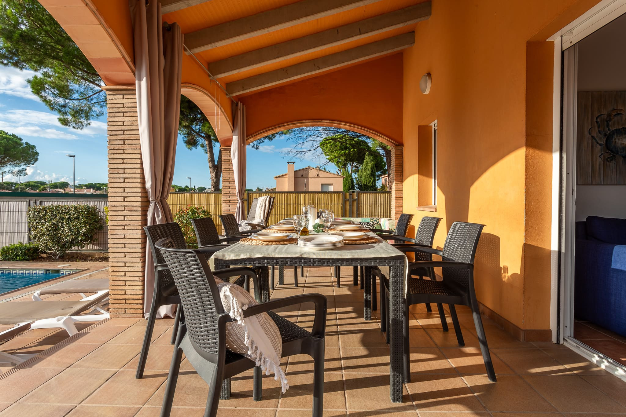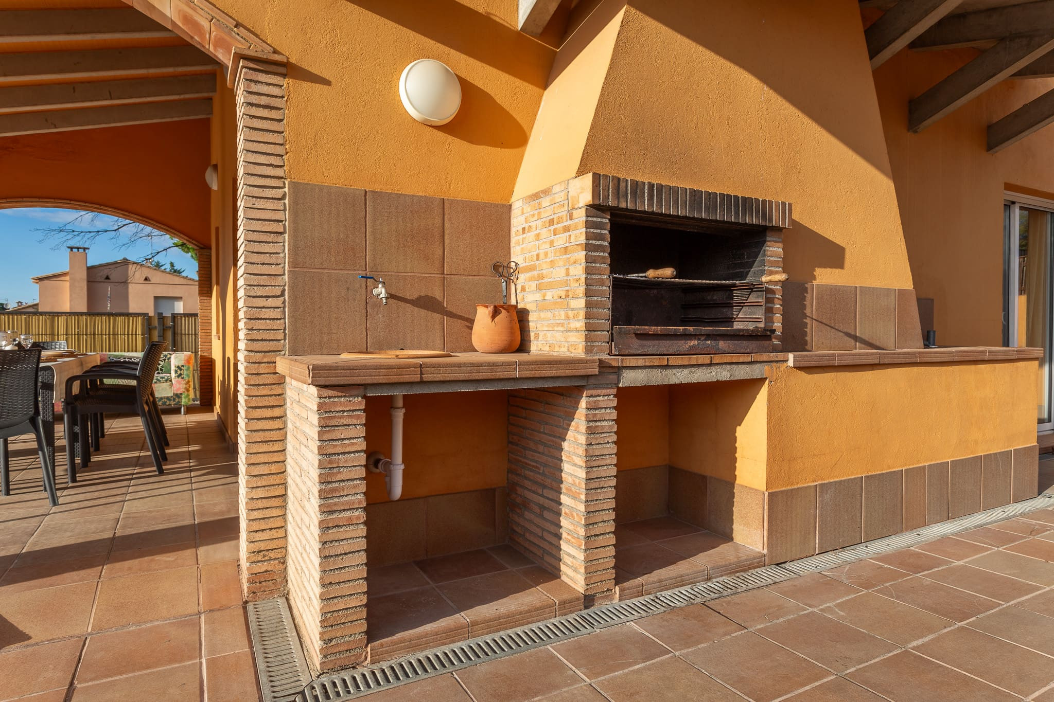 En la terraza del jardín hay una mesa grande para comidas en aire abierto en toda la familia disfrutando de una buena barbacoa!