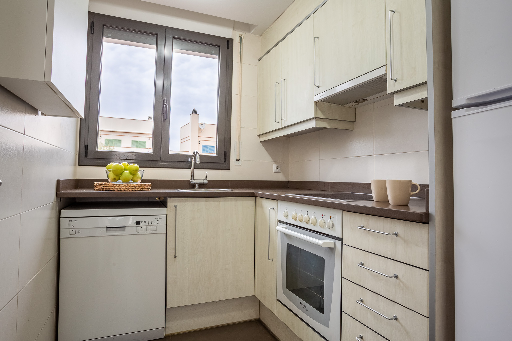 La cuisine est entièrement équipée d'appareils électroménagers modernes, tels que réfrigérateur, congélateur, lave-linge, lave-vaisselle, four, micro-ondes et cafetière, facilitant la préparation de délicieux repas.