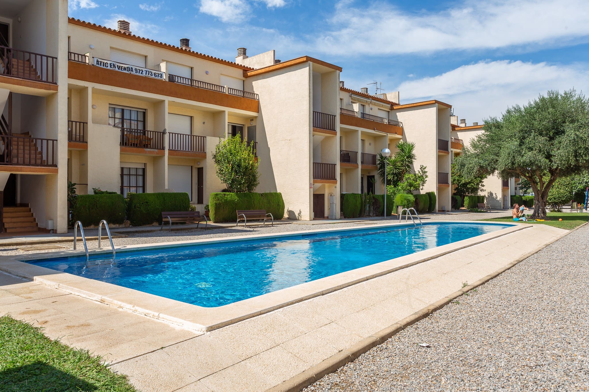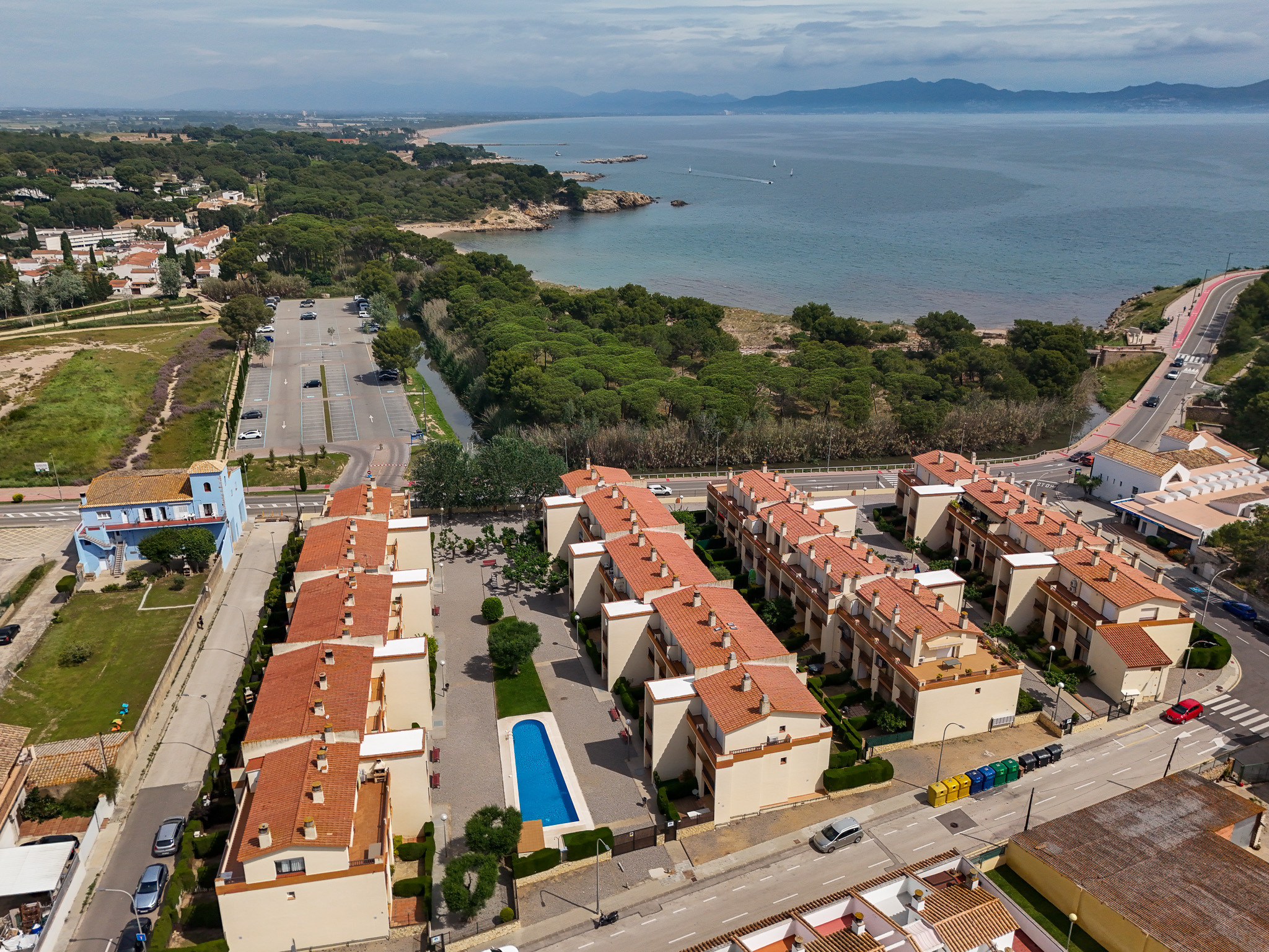 El territori del complex esta tancat i té un pàrquing privat, una piscina i un pati de jocs per als nens.